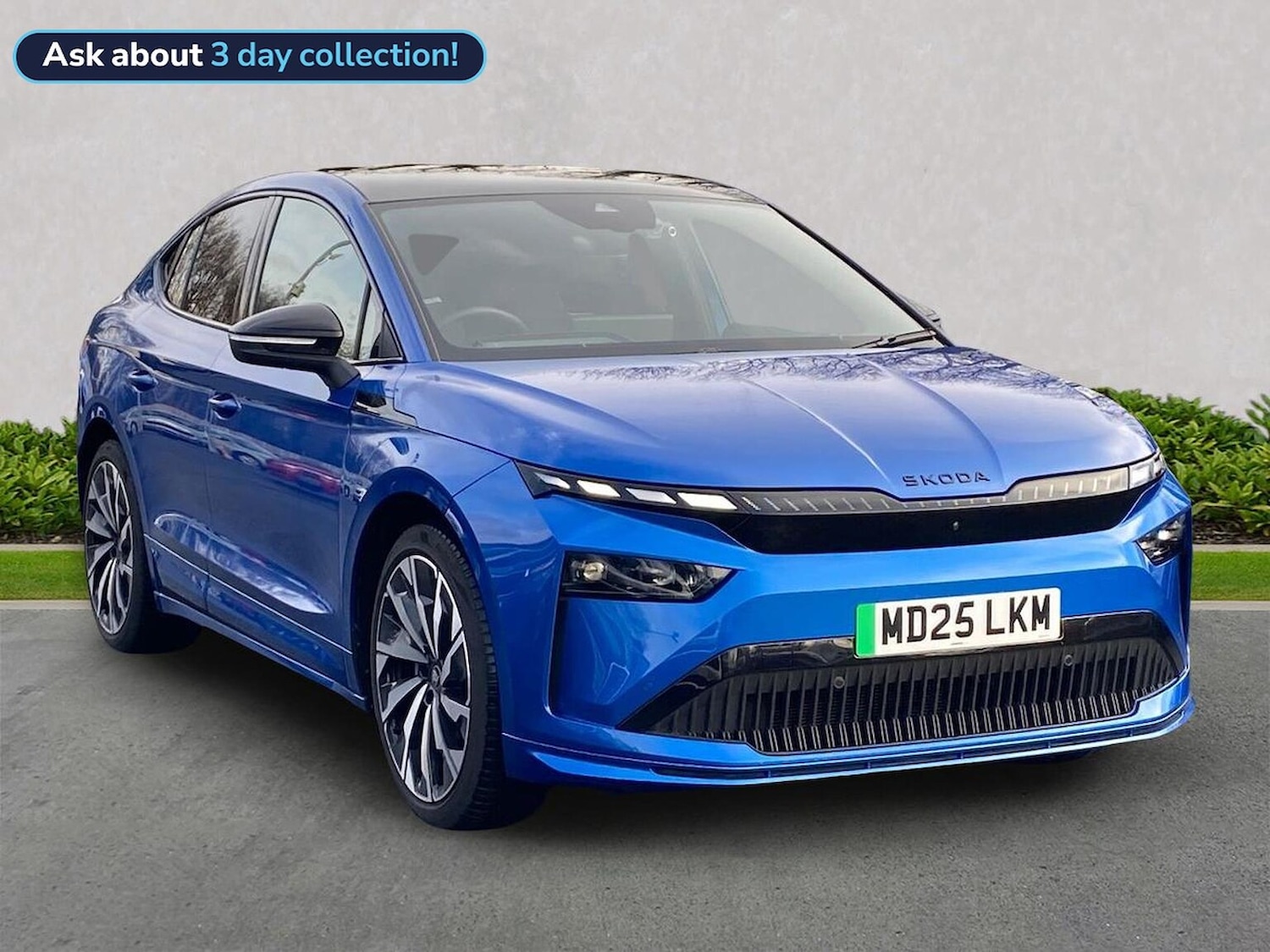 Insurance Group 38, 0 Previous Owners, Franchise Approved, Skoda Enyaq Coup Sportline 85x (82 kWh, 286 PS) finished in Race Blue Metallic with the SportLine Design Selection interior. Factory equipment includes a 13" touchscreen with satellite navigation, Bluetooth, DAB, wireless charging, WiFi hotspot, USBC ports front and rear, SmartLink, eCall, Skoda Connect services and towbar preparation, along with front and rear parking sensors, Predictive Adaptive Cruise Control with Traffic Jam Assist, Blind Spot Detection, Traffic Sign Recognition, Drive Mode Select, Driver Alert and a tyre pressure monitoring system. Exterior features include panoramic sunroof, privacy glass, acoustic side windows, heated and powerfolding autodimming mirrors with boarding spots and welcome logo, gloss black window trim and lettering, sports bumpers, heatinsulating windscreen and 20" Vega Black alloy wheels, with optional 21" Supernova black alloy wheels and tool kit. Inside it offers front sports seats, heated 3spoke sports steering wheel with recuperation paddles, trizone climate control, LED ambient lighting, gesture control, extended interior noise suppression, electrically operated tailgate with virtual pedal, folding boot cover, aluminium pedals, SportLine interior design, transport package and umbrella. Safety features include front, side, curtain and central airbags, Front Assist with automatic braking, Emergency Steering Support with Turn Assist, Crew Protect Assist, ISOFIX on the front passenger seat and outer rear seats with top tether, Keyless Entry with walkaway locking, alarm with interior monitoring and standard electronic engine sound. Performance highlights include allwheel drive, sports suspension, progressive dynamic steering, Mode 3 cable and up to 175 kW DC charging capability. The vehicle is UKspec, not imported, fixed service regime and emission status is not impacted. We offer appointments, personal video appointments, test drives and finance optionsjust let us know how youd like to view the vehicle.