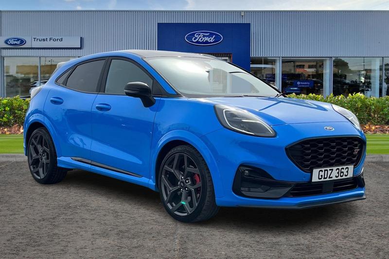 Insurance Group 21, Cruise control with Intelligent speed assist, Driver impairment monitor, Emergency call service, Ford easy fuel, Front and rear parking sensors, Full digital 12.3 instrument cluster, Lane keeping aid with lane departure warning, Power assist steering, Selectable drive modes (normal, sport, eco, track), Speed sign recognition, Automatic headlights with auto high beam, Automatic rain sensing wipers, Dual chrome exhaust, Fixed LED signature headlamps, Front fog lamps, LED daytime running lights, LED rear lamps, Power foldable heated door mirrors with puddle lamps and puma logo protection, Privacy glass to side rear windows and tailgate glass, Quickclear heated windscreen, Rear side wing doors, Rear wiper, ST scuff plates, Third brake light, Unique ST body styling kit including wing mirrors and Ford Performance embossed splitter, 3 seat bench in 2nd row, Alloy sports pedals, Centre console with armrest and stowage, Ford megabox extended bootspace, Ford Performance sensico partial premium leather upholstery with metal grey stitching, Front and rear floor mats, Front and rear head restraints, Manual 6 way driver seat adjust with lumbar adjustment, Manual 6 way passenger seat with lumbar seat adjustment, Single front passenger seat, ST flat bottomed steering wheel with metal grey stitching, ST logo projection, Unique ST gear shift knob, Wireless charging pad with electronic air temperature control (EATC), 3 rear seatbelts, Child safety lock, Electronic stability control (ESC) and