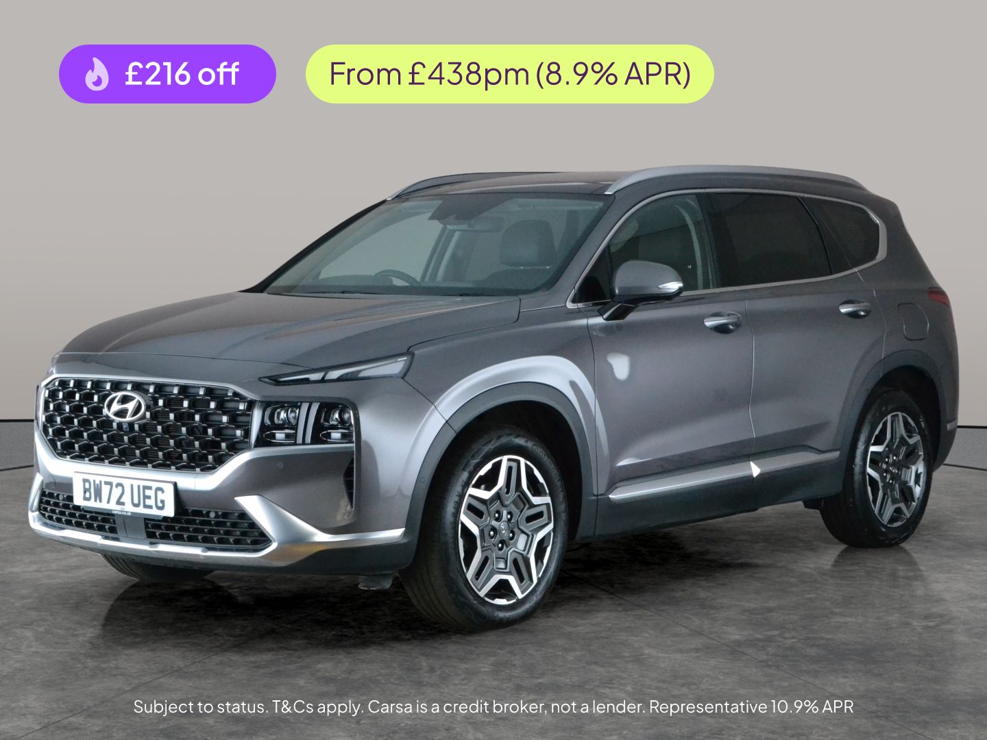 0 Previous Owners, Experience the Hyundai Santa Fe SUV in stunning grey with luxurious touches like a panoramic roof and a clever headup display. Enjoy the comfort of heated seats, a heated steering wheel, and a memory function for your driver's seat. Stay connected with Apple CarPlay and navigate with ease using the builtin sat nav. Safety is enhanced with blind spot assist, lane departure warning, and a surround view reversing camera, while keyless entry and dazzling LED headlights add convenience and style. This petrol hybrid automatic is ready for your next adventure. 3 services recorded, last serviced on 12/01/2026 at 28,435 miles. MOT to 01/02/2027. Visit our website for service history, online valuation, full vehicle specification plus multiple images. This vehicle is VAT qualifying. Any feature/option specified here is from 3rd party data. We cannot guarantee the accuracy of any specification supplied by a 3rd party. We recommend that you physically check the specification of the vehicle on site prior to purchase. This information does not form part of the buying contract. Terms & Conditions apply. We have over 2,000 cars available from our 10 national branches, check our website to see all our stock. Our Trustpilot rating is 4.4/5 with over 9,000 reviews.
