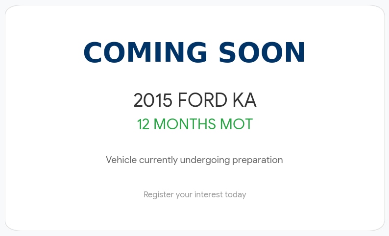 Woodville, SwadlincoteInsurance Group 3, 2 Previous Owners, Coming soon: a 2015 Ford Ka currently undergoing final preparation. The car will be sold with a brand new 12month MOT, a full service, and a new timing belt and water pump already installed. This ULEZcompliant hatchback is an ideal, lowcost choice for any driver; full photos and a detailed specification list will be uploaded shortly.
