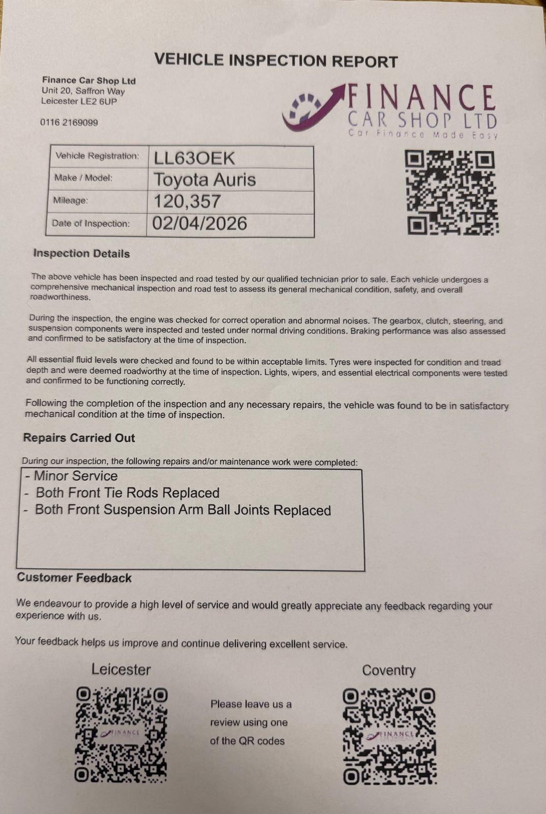 LeicesterInsurance Group 7, 2 Previous Owners, SERVICE HISTORY,JUST SERVICED, REVERSE CAMERA,2FORMER KEEPERS Discover the perfect blend of practicality, efficiency, and reliability with the Toyota Auris Touring Sports 1.8 VVTh Icon Touring Sports CVT Euro 5 (s/s). Combining petrol and hybrid technology, this spacious estate from Toyota offers smooth automatic driving and excellent fuel economy.Powered by Toyotas trusted 1.8 VVTh hybrid system with a CVT automatic gearbox, it delivers a quiet, comfortable drive while keeping running costs low.Key Features:1.8 VVTh Hybrid Petrol Engine Excellent fuel economy and low emissionsCVT Automatic Transmission Smooth and effortless drivingTouring Sports Estate Body Extra boot space and practicalityEuro 5 Compliant Hybrid Efficient and environmentally friendlyIcon Trim Wellequipped with modern featuresEquipment Includes:Reversing cameraDAB radioCruise controlClimate control air conditioningAlloy wheelsMultifunction steering wheelElectric windows and mirrorsSplit folding rear seatsThe Toyota Auris Touring Sports offers a spacious and comfortable interior with a large boot, making it ideal for families, commuting, or longdistance travel.Why Choose This Car?Smooth and economical hybrid automaticLarge estate boot and practical interiorRenowned reliability from ToyotaComfortable and economical to run+ 6 MONTHS WARRANTY INCLUDED + 6 MONTHS BREAKDOWN COVER + EXTENDED WARRANTY AVAILABLE + FINANCE OPTIONS AVAILABLE UPON REQUEST + DELIVERY CAN ONLY BE ARRANGED ONCE THE VEHICLE HAS BEEN VIEWED & INSPECTED IN PERSON AT OUR PREMISES + PHOTO ID IS REQUIRED FOR ALL VIEWINGS AND TEST DRIVES + WE CAN BE REACHED VIA WHATSAPP ON 07458 300017 FEEL FREE TO MESSAGE US + PLEASE NOTE, THE PRICE IS FIXED ON THIS VEHICLE. KINDLY BE AWARE OF THIS PRIOR TO ARRANGING A VIEWING + WE HAVE OVER 50 VEHICLES IN STOCK. AS NOT ALL VEHICLES ARE HELD ON SITE, PLEASE ENSURE YOU CALL IN ADVANCE BEFORE MAKING YOUR JOURNEY + BANK TRANSFER ONLY + MORE CARS AVAILABLE AT:WWW.FINANCECARSHOPLTD.CO.UK +