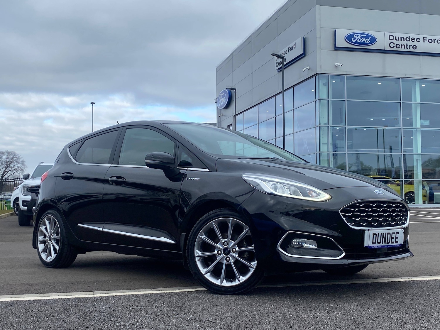 DundeeInsurance Group 13, 0 Previous Owners, 3 point seatbelts on all rear seats, ABS+EBA, Curtain airbags, Driver and passenger airbags, Drivers knee airbag, Electronic stability control with hill start assist, Front passenger airbag deactivation, Front side airbags, Seatbelt warning, Tyre pressure monitoring system, Bluetooth system, Cruise control, Electric power steering, Ford easy fuel, Trip computer, Auto dimming rear view mirror, Body colour bumpers, Body colour door handles, Body colour electric adjustable heated door mirrors with integral indicators, Body colour rear spoiler, Chrome beltline trim, Chrome door handles, Chrome lower window surround, Cornering front fog lights, Electric front windows/one touch facility, Electric rear windows, Halogen projector style headlights with static cornering lights + LED daytime running lights, LED Night signature to rear lights, LED rear lights, Openable panorama roof, Power foldable door mirrors with puddle lights, Privacy glass, Quickclear heated windscreen, Rain sensing wipers and auto dimming rear view mirror, Rear privacy glass, Rear wiper, Special solid paint, Tinted glass, Unique Vignale front grille and bodystyling, Vignale front door threshold plates, Vignale rear and wing badges, 12V Accessory socket in centre console, 3 spoke leather trimmed steering wheel with audio control, 60/40 split folding rear seat, Adjustable head restraints, Air conditioning + Electric Auto Temperature Control (EATC), Ambient lighting, Boot carpet, Centre console with armrest and illuminated cupholders, Chrome inner door handles, Drivers and Passenger lumbar support, Footwell illumination, Front map reading lights, Front seat and rear pockets, Front/rear floor mats, Illuminated glovebox, Leather gear knob, Leather trimmed handbrake handle, Leather upholstery, Load area light, Luxury woven headliner, Overhead console with sunglasses holder, Pollen filter, Rake/reach adjustable steering wheel, Rear centre head restraint, Comfort Pack Fiesta, NCAP Pack Fiesta, Rear view camera pack Fiesta, Ford keyfree system with Keyless entry and keyless start with two remote keys, MyKey system, Remote central locking and engine immobiliser, Thatcham Cat.1 alarm, 2 USB ports, Auxiliary input socket, BandO Premium audio system with 8 inch touchscreen, 10 speakers, 360 degree sound system, Ford SYNC 3 navigation system and Ford pass connect, DAB Digital radio, Steering wheel mounted controls, 17 inch 10 spoke alloy wheels with luster nickel finish, Tyre repair kit