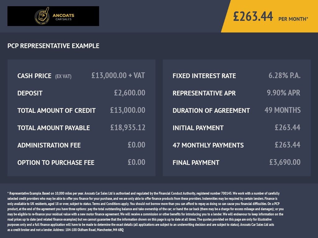 If your borrow amount is £6,500 with a deposit of £1,000, a selected term of 48 months, at a representative APR of 12.9% (fixed) and an annual fixed rate of interest of 12.9% you would pay £171.79 monthly. Total charge for credit will be £1,745.92 and total amount repayable is £9,245.92