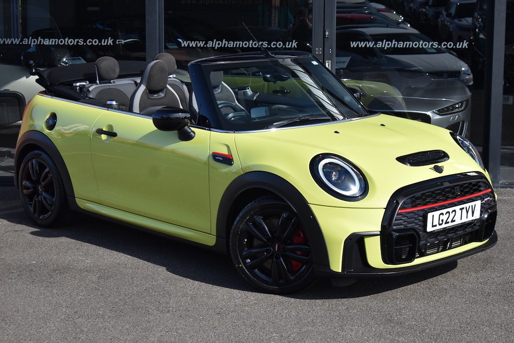 Wigan2 Previous Owners, ++PREBOOKED APPOINTMENT REQUIRED++RESERVE & COLLECT++VIDEO PRESENTATION++, Alpha Motors a familyowned awardwinning business for over 40 years in Wigan are proud to offer for sale this Mini Cooper John Cooper Works Cab. Presented in Zesty Yellow paint and sits on 17inch Gloss Black alloys. Inside boasts a Carbon Black DinamicaCloth JCW Sport Seats and Silver Chequered interior detailing. Great specification car inc Wireless Phone Charger, Head Up Display, Electric Windows, Powerfold Mirrors, Auto Wipers, Auto Lights, Digital Cockpit, Voice Command, Cruise Control, Speed Limit Control, Ambient Lighting, DAB Radio, SATNAV, Bluetooth, Carplay, Reverse Camera, Front and Rear Park Sensors, Heated Front Seats, Heated Front Windscreen, Digital Climate Control, Sport + Green Driving Modes, Keyless Entry, LED Headlights, LED Union Jack Rear Lights, 17inch Gloss Black Alloys, Plus Much More. SERVICE HISTORY: services 15288 MINI, 30238 MINI, 38457. +++6 Months warranty & 6 Months Breakdown cover from £249+++ +++EXTENDED WARRANTIES AVAILABLE+++ Professionally prepared to the highest standards and presented with 2 keys, HPI clear report. Alpha Motors is a multiawardwinning, independent familyowned used car dealership and has been established for over 40 years. All our used vehicles undergo a comprehensive wheelsoff predelivery inspection and are covered by our comprehensive warranty for your peace of mind. We can offer you a full no obligation valuation on your part exchange vehicle. All our cars receive a full valet before collection and we also cater to customers whatever your credit history. View our finance calculator on our website. Read some of our +500 5star customer reviews, and come and visit our indoor prestige heated showroom! Luxury Tax may apply.. 12V Socket in Centre Console,17in Alloy Wheels John Cooper Works Track Spoke,17in Sport Brake,3 Point Seatbelts on all Seats,4 Lashing Eyes in Luggage Compartment,8.8in Touch Screen with LED Ring,Active RollOver Protection,Air Conditioning Manual,Airbags,Alarm System,AntiLock Braking System ABS,Apple Carplay,Automatic Headlight Activation Switch,Bluetooth for Compatible Mobile Phone with Audio Streaming,Bonnet Scoop,Brake Calipers Red With John Cooper Works Logo,Carbon Black Colour Line Knee Roll and Door Armrests,Chrome Highlights,Convertible Pack,Cruise Control with Brake Function,Cupholders,DAB Tuner and FM Tuner,Door Storage Compartments,Dynamic Brake Lights,Dynamic Stability Control DSC,Easy Load Function,Electric Windows Front,ElectroMechanical Steering with Speed Dependant Steering Assistance,Electronic Vehicle Immobiliser,Exhaust Tailpipe Double Central with Chrome Finishers,Flexible Car Sharing Preparation,Floor Mats Velour,Folding Rear Seats 5050,Front Passenger and Rear ISOFIX including Front Passenger Airbag Deactivation,Fuel Filler Cap in Piano Black,Fully Electric Black Soft Top with Integrated SunRoof Functionality,GearChange Indicator Display,Glove Compartment,Heated Rear Window,Heated Windscreen Washer Jets,Instrument Cluster,Interior Lighting,Interior Trim Piano Black,John Cooper Works Aerodynamic Kit,John Cooper Works Sport Seats,Keyless Go,LED Headlights with Closed Ring as Daytime Driving Lights,LED Reading Lights Vanity Mirror Lights Front Foot Well Lights Spotlights on Front Seats,Leatherette Gearshift Lever and Handbrake Gaiters,MINI Driving Modes,MINI ECall,Mechanical Seat Adjustment ForwardBack and Backrest for Front Seats Driver Seat Height Adjust,Mirror Caps in Body Colour,Model Logo Cooper S on Right of Tailgate,Multifunction Controls for Steering Wheel,OnBoard Computer,PDC Park Distance Control Rear,Pedals Rubberised Stainless Steel,Performance Control,Piano Black Exterior Trim,Radiator Grille Piano Black Border with Honeycomb Structure in Black Matt,Rain Sensor Window Wipers,Rear Fog Light,Rear LED Lights with Union Jack Design,Side Scuttle with MINI John Cooper Works Logo in Black HighGloss with Red Border,Side Scuttles with Integrated Indicators,Speakers 4,Sport Suspension,Steering Column Height and Length Adjustment,Storage Pockets on Back of Front Seats,Sun Visor with Vanity Mirrors,SunHeat Protection Glass,TPWS Tyre Pressure Warning System,Teleservices,Tool Kit,TwoTone Horn,Walknappa Leather Steering Wheel with Grey Seam John Cooper Works Badge on Piano Black Lower Steering Wheel Spoke,White Indicators,Adaptive Suspension,Comfort Plus Pack,DinamicaLeather Carbon Black,Harman Kardon HiFi System,Heated Front Windscreen,Interior Trim Silver Chequered,Navigation Plus Pack,Steering Wheel Heating,Zesty Yellow,Mirror Caps Black