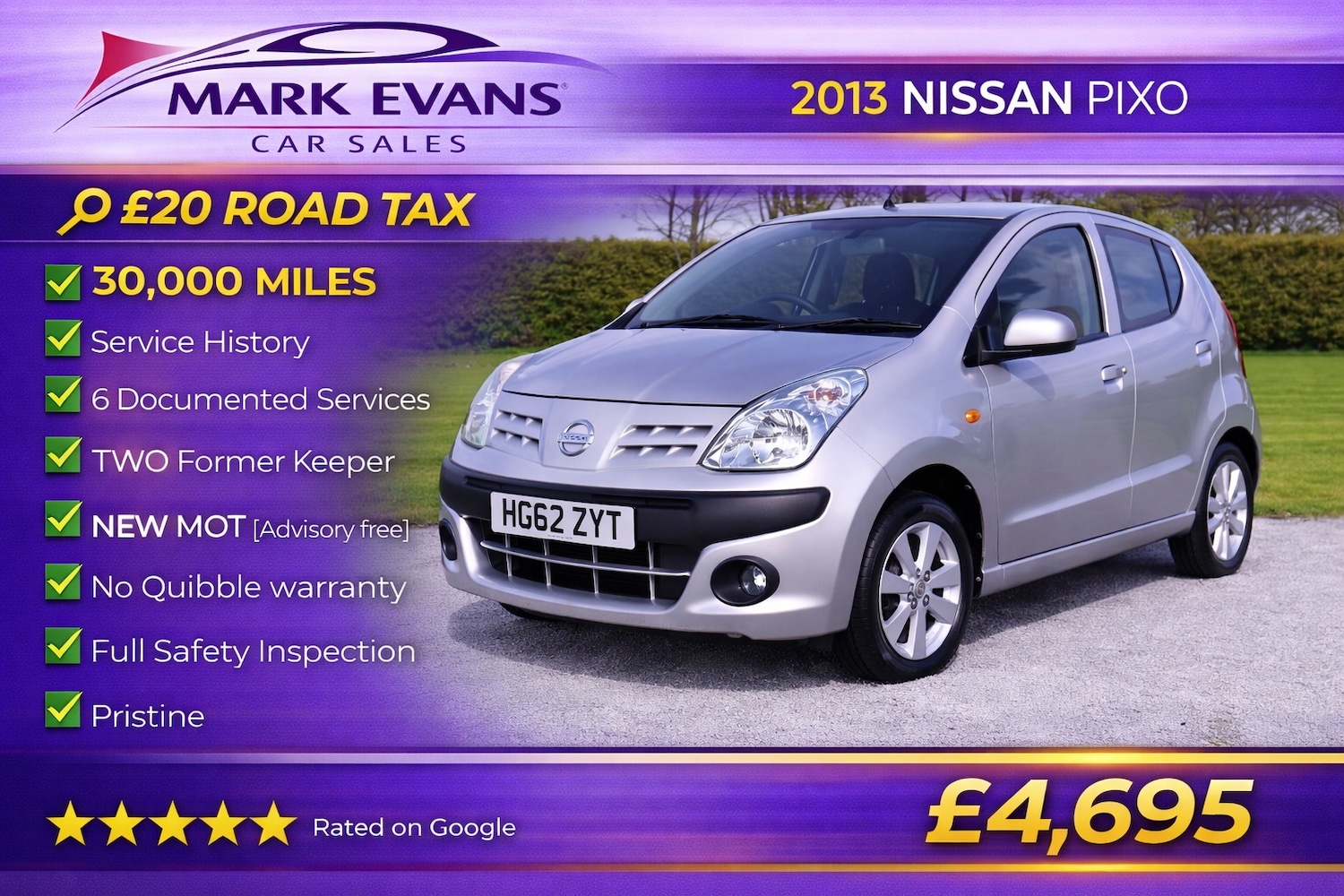 St AgnesInsurance Group 4, 30,000 MILES SERVICE HISTORY 6 DOCUMENTED SERVICES TWO FORMER KEEPERS £20 ROAD TAX......This 2013 Nissan Pixo is a superb low mileage example with just 30,000 MILES from new, supported by a SERVICE HISTORY with 6 DOCUMENTED SERVICES. It has had only TWO FORMER KEEPERS and is presented in pristine condition both inside and out......The vehicle will be supplied with a brand new MOT with NO ADVISORIES, a NO QUIBBLE WARRANTY, a full professional valet and a complete safety inspection, giving total peace of mind......One of the standout features of this vehicle is its incredibly low running costs, with just £20 ROAD TAX making it an exceptionally economical choice. Combined with the efficient petrol engine, it offers excellent fuel economy and low insurance, making it ideal for first time drivers or anyone looking for affordable motoring......Compact, easy to drive and very practical, this Pixo is perfect for city driving and everyday use, offering simplicity, reliability and low cost ownership......At £4,695, this is a fantastic opportunity to purchase a low mileage, well maintained and highly economical example......We specialise in sourcing the very best low mileage high quality vehicles. Mark Evans Car Sales is based in St Agnes Cornwall TR5 0PA. We pride ourselves on our honesty integrity and five star service. Please take a moment to read our five star Google reviews, we are very proud of them. The Evans family has been in the motor trade in Cornwall for over 50 years and we continue to work hard to uphold our reputation for quality and trust.