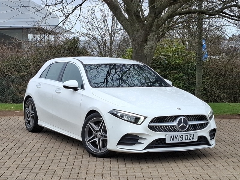 AberdeenInsurance Group 28, Light and sight pack A Class, Seat comfort pack A Class, 180 degree rear view camera with parking guidelines, Active park assist with parktronic system including front and rear parking sensors, DYNAMIC SELECT with a choice of driving modes (ECO, Comfort, Sport and Individual), Harddisk navigation, Hey Mercedes Voice activation, Radio aerial integrated into roof spoiler, Lowered comfort suspension, MBUX multimedia system with DAB digital radio and touchpad including satellite navigation, Active aerodynamics with AIRPANEL in the front apron, AMG front, rear apron and side skirts, Diamond radiator grille with chrome pins and silver louvre + chrome insert, Exhaust system Twin trapezoidal tailpipes in polished stainless steel, LED high performance headlamps with integrated LED daytime running lights, Privacy glass, 3 Spoke flat bottom leather multi function steering wheel with perforated leather in grip area, AMG floor mats with red stitching, Artico manmade leather/Microfibre Dinamica upholstery with red contrast stitching, Sports seats with integrated headrests, Heated front seats, Interior lighting 64 colour Ambient lighting, Two zone thermotronic luxury automatic climate control, Keyless entry lock/unlock, Alarm system/interior protection/immobiliser, 18" AMG 5 twin spoke light alloy wheels in titanium grey with highsheen finish