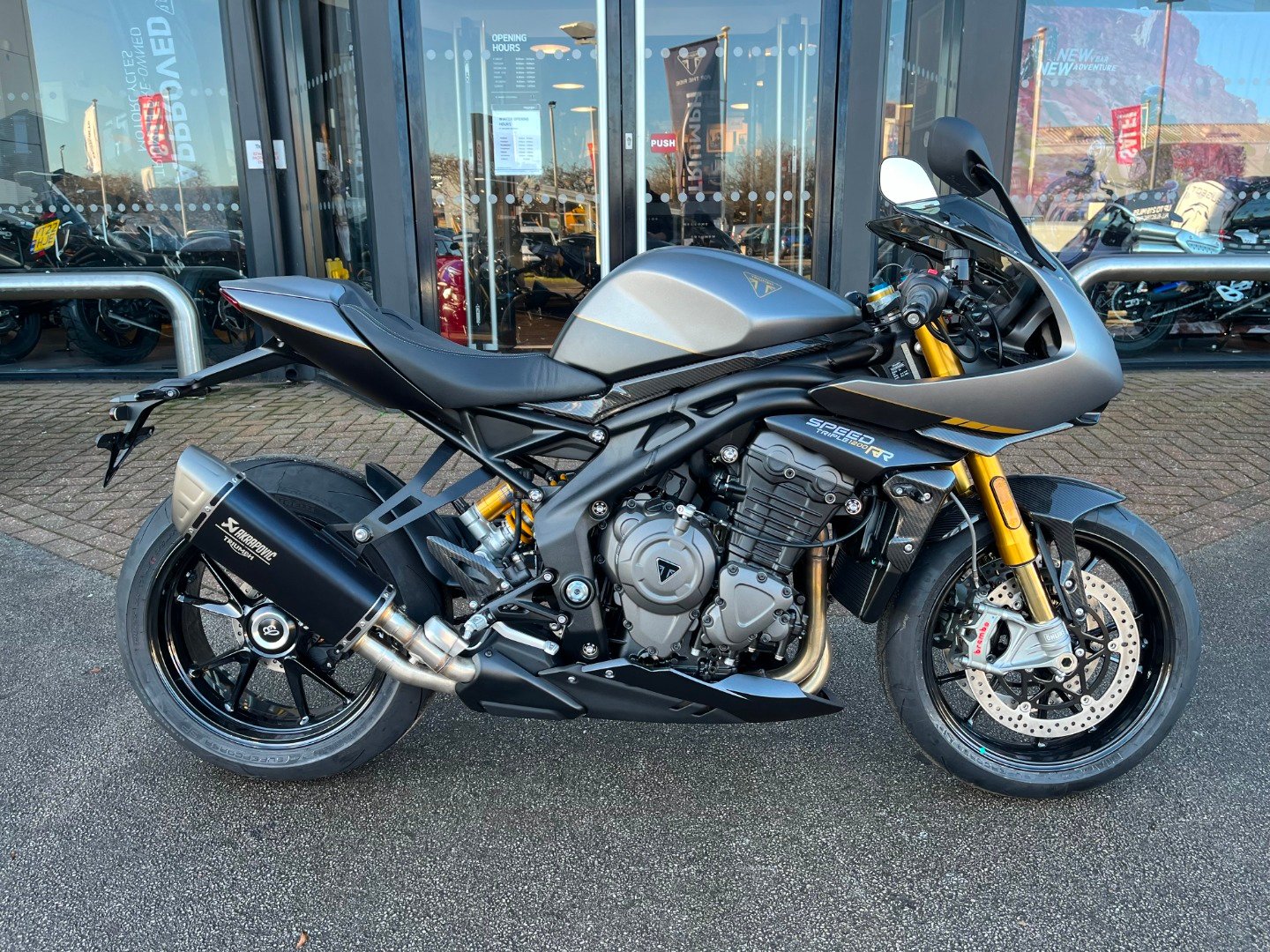 ChesterfieldSPEED TRIPLE 1200 RR BREITLING LIMITED EDITION NEW A truly special Limited Edition of Triumph’s top of the range Speed Triple 1200 RR, inspired by a shared reputation for world leading precision and performance. Limited to 270 worldwide, each bike features an individually numbered billet top yoke and Breitling ‘startup’ screen, plus beautiful detailing and unique, premium features. Deep and lustrous metallic paint scheme with gold hand lined detail, together with subtle Triumph and Breitling branding. The Limited Edition includes a highspecification Akrapovic titanium silencer, light weight carbon fibre components, scrolling LED indicators, plus all the latest Speed Triple 1200 RR ‘s leading specification.Available for order now! Call us for a personalised video now!Further photos, and personalised videos are available on request. Ring now and don't miss This stunning bike!PLEASE CLICK ON OUR PROFILE TO VIEW ALL OF OUR BIKES ON AUTOTRADERCALL NOW TO SECURE THIS BIKE!