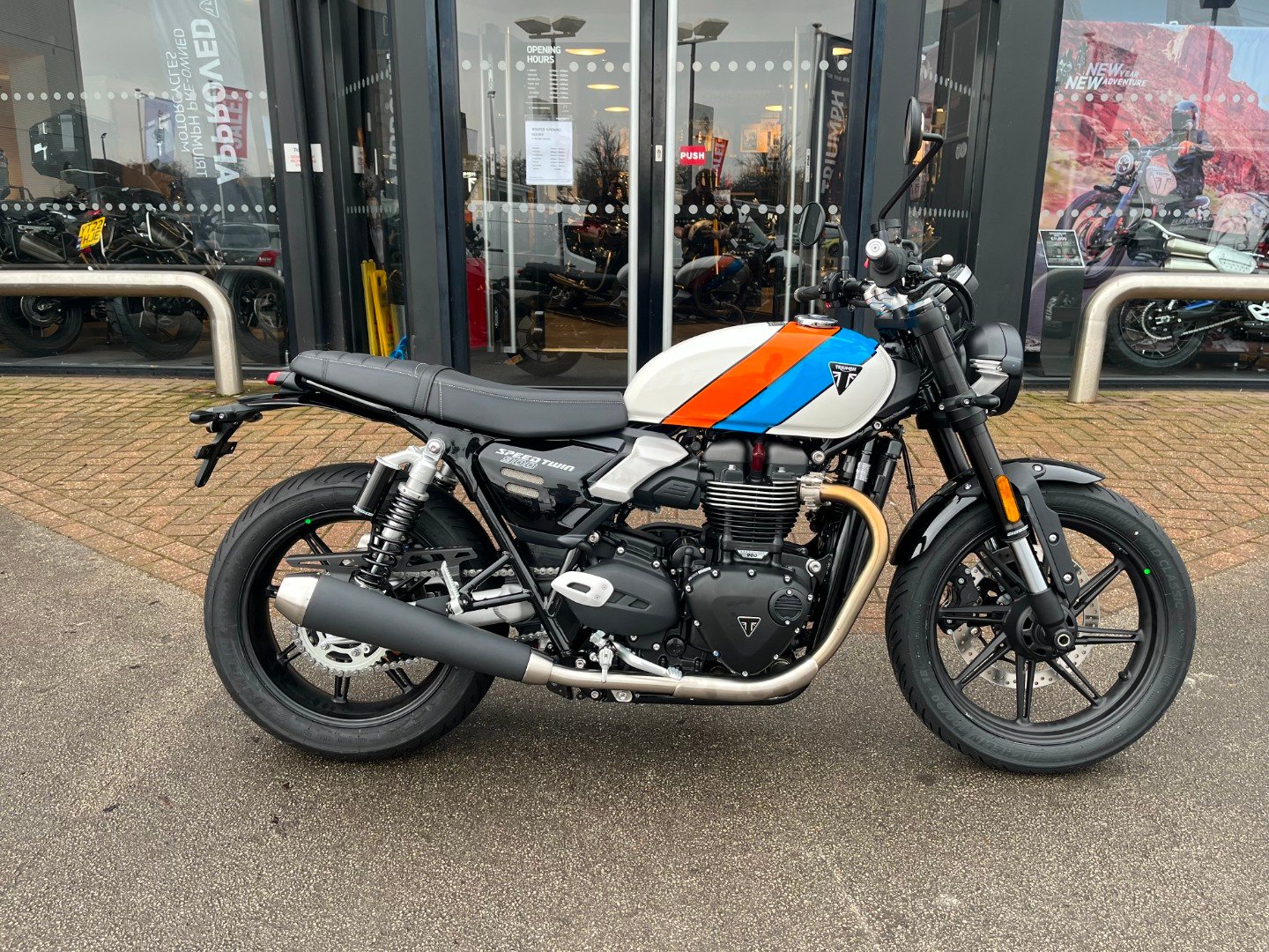 ChesterfieldNEW Speed Twin 900 Pure White Brand New Model other colours available for Preorder TicketToRide eligibleIconic Bonneville DNA redesigned to produce a modern evolution on a British icon whilst keeping that distinctive classic silhouette that is instantly recognisable. The Speed Twin 900 utilises the iconic 900 British twin that delivers a captivating experience with its deepthumping exhaust note and rich power delivery. The New sculpted, muscular tank and chiseled side panels add a modern twist along with the addition of new rider assist technologies. The NEW Speed Twin 900 really is the perfect blend of timeless cool and modern performance.This lovely bike is finished in Pure White with a Tangerine Orange and Maui Blue Stripe across the tank which looks stunning in the flesh. This bike is a stock standard bike and so would be a lovely blank canvas for modification using the wide range of Triumph Genuine accessories. As a New bike this comes with 24 month s Warranty, 24 months Triumph RAC Assist and the first years Road fund included.This bike is available now for immediate registration.Further photos and personalised videos are available on request.CALL NOW TO TEST RIDE AND SECURE THIS BIKE!