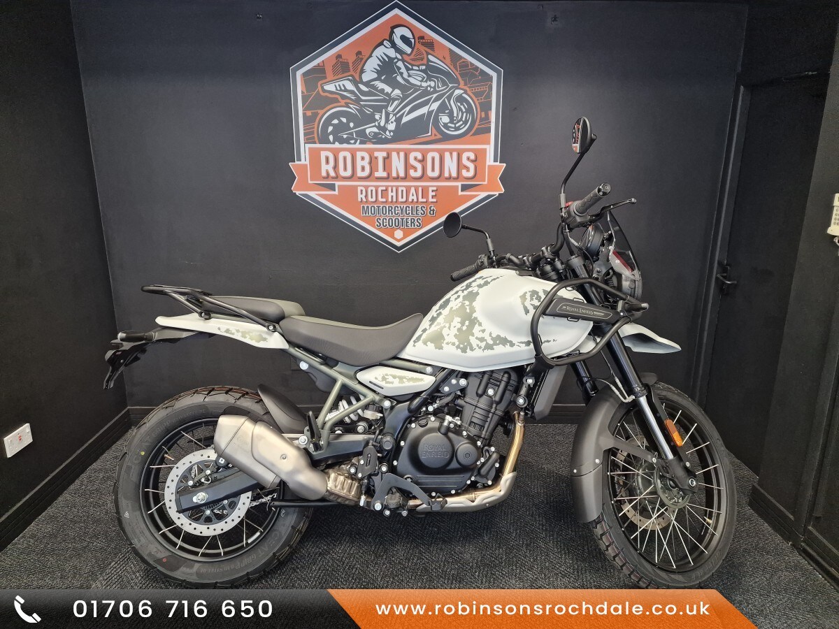 AdlingtonRoyal Enfield Himalayan 450. Prices from £5750 Now available on 5.9% APR HP and PCP.The 450 Himalayan is an evolutionary leap ahead of it's predecessor, with it's new 450 Sherpa engine which produces an astonishing 40 bhp & 40 nm of torque. The Sherpa gives you 90% of its torque from 3000rpm upwards giving you that all important low down grunt that we have come to know & love from the Himalayan. Coupled with a new 6 speed gearbox, overtaking performance is transformed with 60% + more power higher up in the rev range., The all new twinspar frame is a work of art, the Himalayan is now stiffer & stronger with showa suspension with 200mm of travel at each end. Thanks to the wizardry at the design team shifting the airbox above the motor, the bike is now narrower between the legs making for a much nicer riding position & again better control over the bike. This also increases wading capability. The team have given the bike more ground clearance now 230mm yet due to the clever adjustable seat height we haven't lost the Himalayans accessibility & have managed to get a seat height of 805mm 845mm & a dry weight of just 181kg., If the engine & chassis hasn't wet your appetite enough, Royal Enfield have worked closely with Google to create the worlds first full map navigation on a circular display controlled by a single joystick on the switchgear!! The bike has just the right amount of technology like the new Tripper, ride by wire, and rider modes. And it keeps the true essence of a Himalayan pure motorcycling. There are three variants. The Base variant is Kaza Brown at £5749. The Pass variant is Slate Himalayan Salt & Slate Poppy Blue at £5849. Then the range topper is the Summit available in Hanle Black £6049 & Kamet White £6249. Kamet White has alloy rims & tubeless tyres. Place your deposit now to secure a bike. We are located just off the M62 at Junctions 20 or 21. Please call or WhatsApp on 01706 716650 to discuss further.