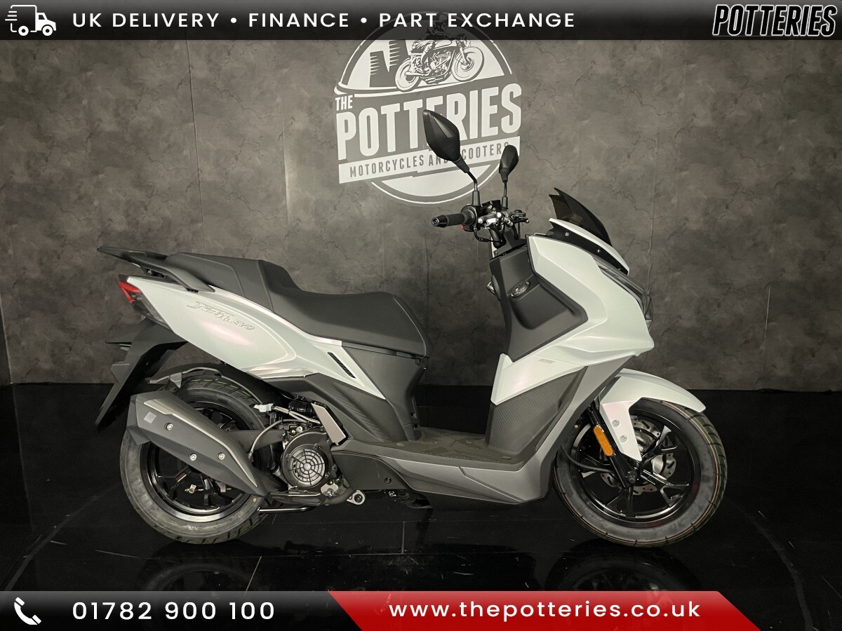 AdlingtonNEW SYM JET 14 EVO 125cc AC Scooter Nationwide delivery available, Part exchange welcome and Finance arranged over the phone or in store.Buying from a distance? Why not ask for a video walk round via WhatsApp 07594817630. We can then deliver direct to your door with a seven day money back guarantee. Over 200 New and Used bikes in store in our stunning 20'000 Square foot showroom based Just off the M6 in Stoke on Trent. 01782 900100The JET 14 is the most successful model of the JET series and remains the top selling model in the UK and Europe Brimming with features including an economical fuel injection system, a fully revised Air Cooled engine and disk brake CBS Combined Braking System providing more than enough stopping power for any situation and an allnew chassis feels that feels nimble, yet sure footed with a Low seat height of Only 770mm and comfort aplenty for Any City streets.The Jet 14 Evo features the following improvements from previous Jet 14 models: Inherited SYM Maxiscooter DNA for the urban sport design, smoked screen, stylish new mirrors and new wheels. Full LED lighting and dynamic front turn indicators. Hazard lights are also now standard. New 5inch colour LCD dashboard with autodimmer and ambient temperature display. USB TypeC and TypeA (QC3.0) dual charging sockets for enhanced flexibility. Foldable shopping hook and integrated top case carrier for additional convenience. Longer wheelbase and A.L.E.H stabilisation improves leg room and ride quality. Wider rear tyre for improved comfort and stability. Fuel filler moved from under seat to leg shield for improved convenience. Underseat storage area is enlarged to 28L due to the relocated fuel tank. Euro 5 + emissions compatible.The Jet 14 125 EVO takes scooter commuting / leisure riding to the next level.Colours available: Gloss Grey, Silver, Matte Blue/Grey, Matte Black and Matte Chameleon White*OTR charges plus £200 includes the first registration fee, road fund licence, number plate and PDI*Finance subject to terms and conditionsPlease contact your local SYM dealer for more information.
