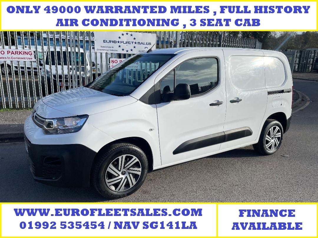 Hertford1 Previous Owner, Full Service History, This 2021 Citroen Berlingo Enterprise M SWB is a standout choice, having been owned by just one careful keeper from new and boasting a remarkably low mileage of 49,000 miles for its age. This practical 5 door van is powered by an efficient 1.5 litre BlueHDi diesel engine, meeting Euro 6 emissions standards. Inside, you'll find comfort and convenience with air conditioning and height adjustable halogen headlights that automatically switch on. Entertainment and connectivity are handled by an 8 inch colour touchscreen featuring Citroen Connect DAB radio, Bluetooth handsfree, a USB socket, and an Aux in jack. Parking is made easier with rear parking sensorsFULL SERVICE HISTORYAIR CONDITIONINGDIRECT MAJOR UK FLEETSPARE KEYS** 3 SEAT CAB **PRESENTED READY FOR WORK TO OUR USUAL VERY VERY HIGH STANDARDS , LOW RATE FINANCE AVAILABLE , ALL MAJOR CARDS ACCEPTED , ( EURO FLEET SALES LIMITED IS REGISTERED WITH THE FCA FRN No 791817 AND RECEIVES A COMMISSION ON FINANCE PLACED WITH CERTAIN COMPANIES).The Berlingo Enterprise M offers impressive practicality, with a substantial 3900 litre cargo volume, making it ideal for business needs. Its fuel economy is a notable highlight, achieving an excellent 54 miles per gallon, which indicates it is more economical than many similar vehicles. Furthermore, its low CO2 emissions contribute to a more environmentally friendly drive. These combined factors demonstrate that this particular Citroen Berlingo represents a superior option for those seeking a capable and cost effective van., Price Plus VAT