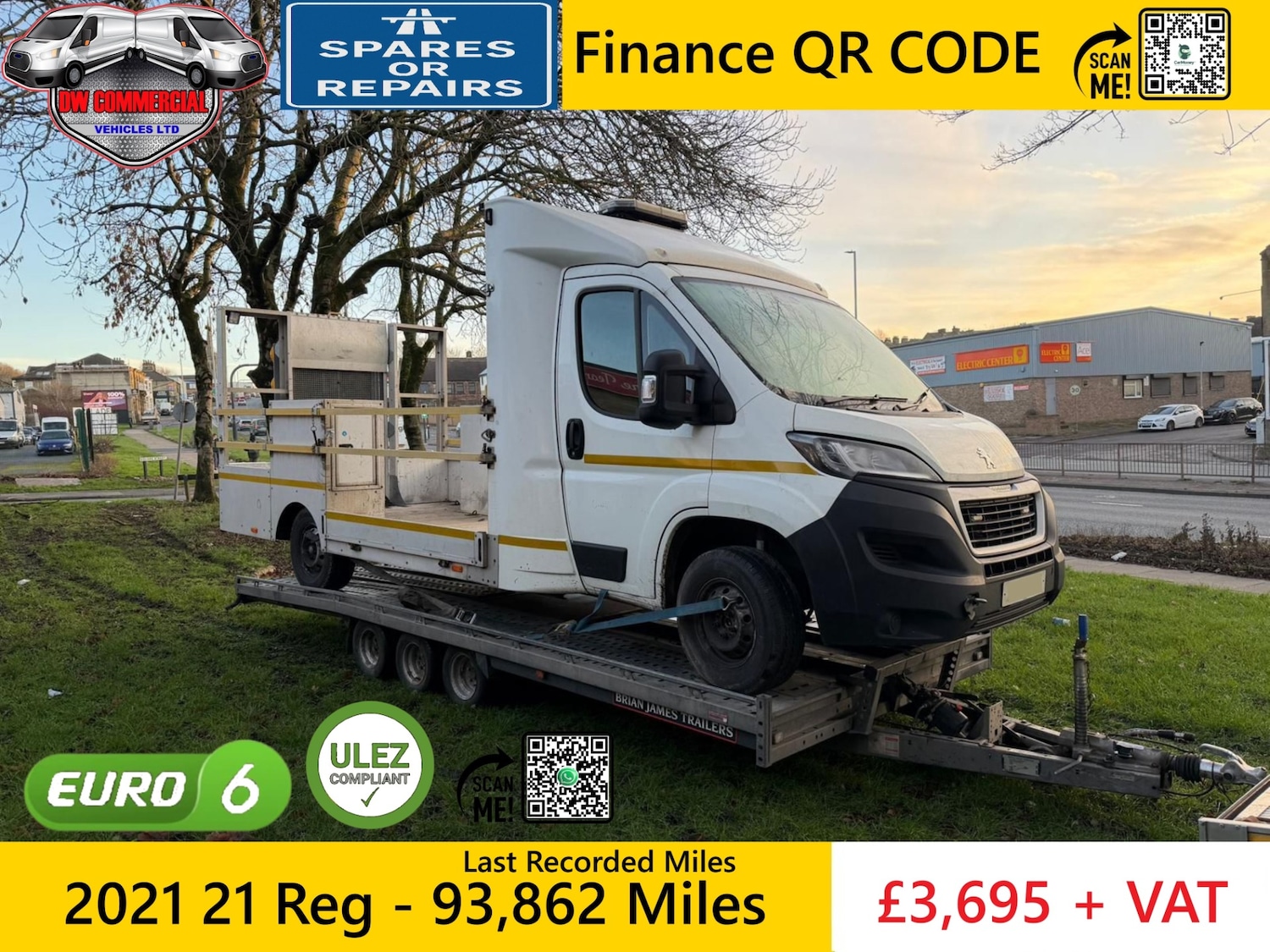Bradford1 Previous Owner, Peugeot Boxer 2021 21 Reg, Mot expired on this vehicle 30th June 2025 and the last recoded mileage on the MOT was 93,862 miles. Electric Windows, Electric Mirrors, USB Input Port, Euro 6, Ulez Compliant & Caz Compliant, Lightweight Alloy Dropside With Folding Tail Lift, Storage Boxes, Flashing Strobe Lights, Rear Working Night Lights, 3 Seater, Power Steering, Remote Central Locking, 6 Speed Manual Gearbox, 140 BHP, Specialised Motorway Vehicle, Low Loader With Alloy Lightweight Ramp, Reversing Camera. Spares Or Repair due to no engine or gearbox or battery, this vehicle has come as is and will need to be recovered away. £3,695 + VAT, 1 x key. Nationwide delivery available on all our vehicles. Anymore info pls call Or WhatsApp, Scan the QR code on the main Photo.