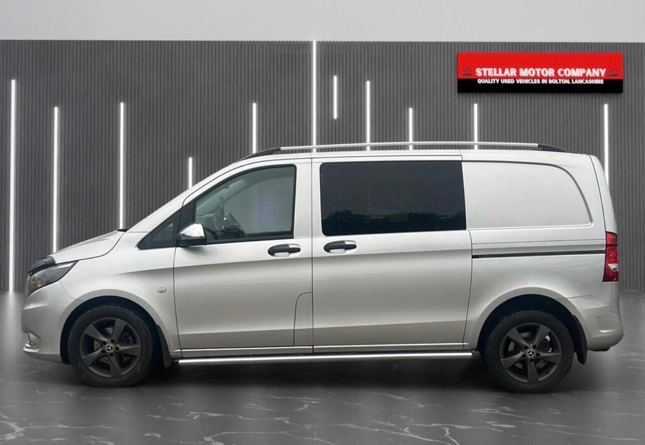 Very tidy example of a factory crew cab Vito with 5 seats, MOT April 2026, top spec with extras such as reverse camera, roof rails, alloy wheels, chrome side steps, chrome exterior kit, parking sensors, air con, paddle shift, tinted rear windows etcfinished in a very nice metallic silverstarts and drives brilliantEURO 6 and ULEZ compliantNO VATNO VATNO VAT