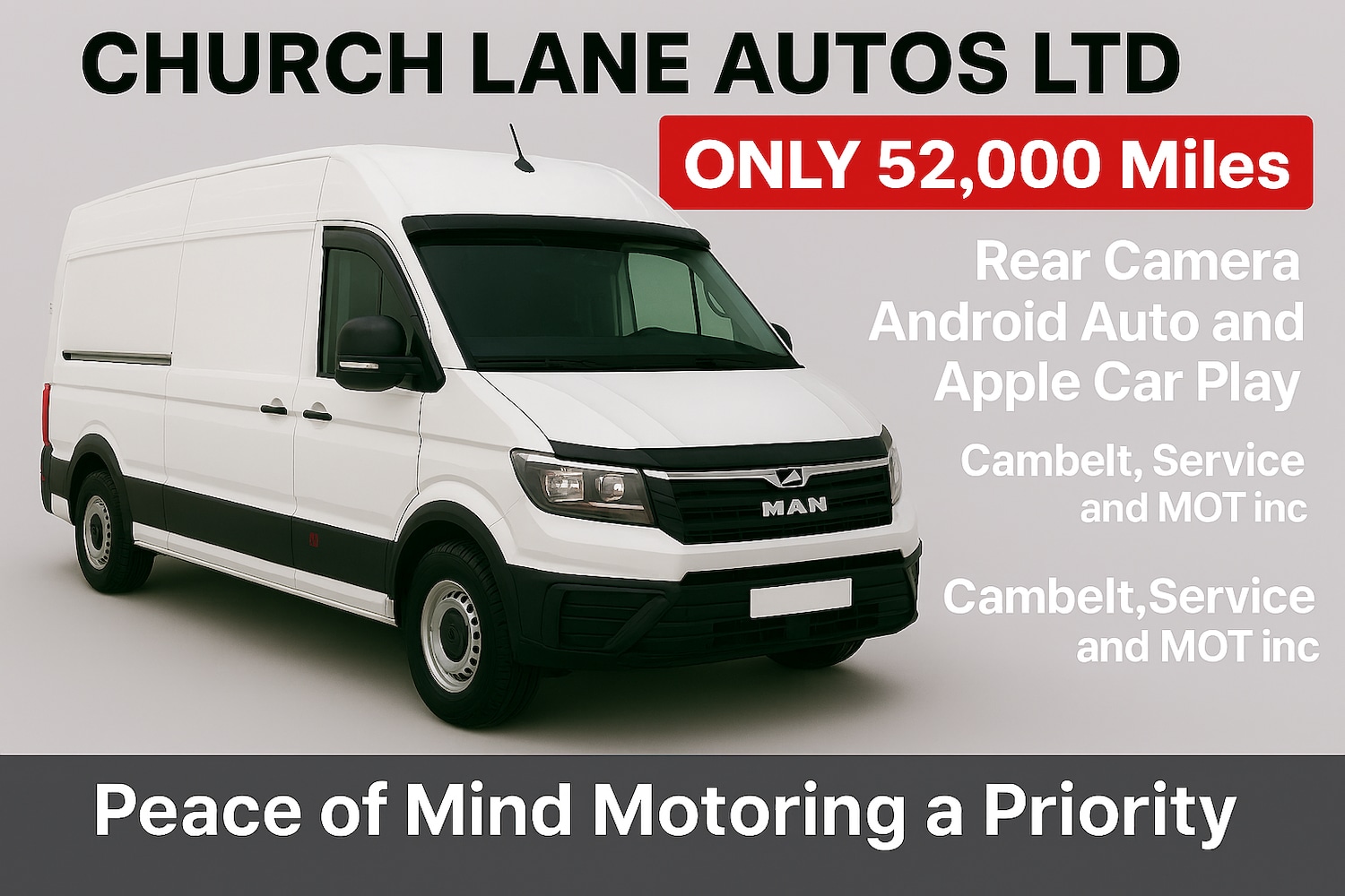 Whaley Bridge1 Previous Owner, Full Service History, Due for Imminenet Arrival, we are pleased to be able to offer this lovely 52'000 Mile MAN TGE High Roof Long Wheel Base Front Wheel Drive 140 Lion Panel Van. Well presented throughout and with a comlete service record and 2 keys, this vehicle should be with us Imminently. Please call for further information or to arrange viewing and test drive. The MAN TGE van and Brand are a powerhouse combination with a renowned great dealer support network and well known reliability, this high roof long wheel base is a cavernous truck that is well suited as a business partner or for a spacious conversion. This example is already equipped with forward travel assist, anti skid control, cruise control, android auto touch screen media console with fantastic phone integration providing Sat Navigation via apple car play or android auto, the vehicle also benefits from an integrated rear high level camera display. with only 52'000 miles it has many many many many more years and miles to give to its next keeper, we are currently carrying out preperation of the vehicle which includes a Full Service, A new MOT a replacement cambelt all for added peace of mind and inclusive of the advertised price, all our vehicles come with our own 3 months 3000 mile engine and gearbox warranty, we can also supply additional warranty options at extra cost. Finance is also available via Autobahn our finance partner., Price Plus VAT
