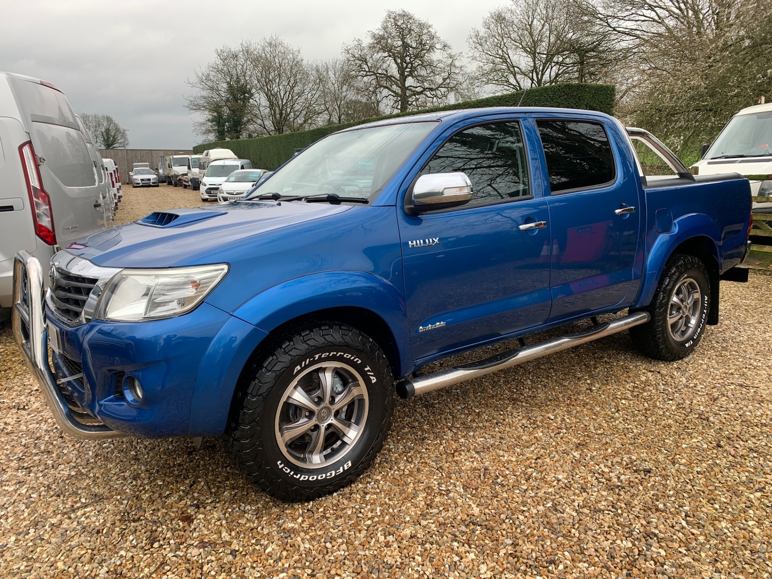 Partial Service History, NO VAT!! NO VAT!! Bright blue metallic Toyota HiLux double cab pickup with NO VAT. Good looking pickup finished in Island Blue Metallic with some additional chrome features such as a front bull bar, rear roll hoop, side steps, a sliding Mountain Top roller load cover, heavy duty moulded plastic load liner and a substantial rear tow bar. Good service history with 9 recorded services, a new TIMING BELT KIT fitted at 65,015 miles in September 2025. 4 x recent matching B.F.GOODRICH ALL TERRAIN 2657017 tyres fitted in April 2025 at 64,000 miles on upgraded Toyota diamond cut alloy wheels that are in very good condition. Black ECO leather interior trim with red detailing. This popular well equipped double cab is fitted with the tough 3.0 D4D 4 CYLINDER 170 BHP DIESEL engine and a 5 speed manual gearbox. Supplied complete with 2 keys, load cover lock, owners handbooks, service history with 9 service stamps, spare wheel, toolkit, jack and locking wheel nut key. Nicely equipped being the Invincible X version with power assisted steering, ABS brakes, traction control system, cruise control with speed limiter, SATNAV, CD radio stereo, USB, multifunction trip computer, steering wheel mounted audio controls, automatic airconditioning, front and rear parking sensors, front foglights, automatic headlights with wash function, remote central locking, electric front and rear windows, electric heated powerfold door mirrors, drivers airbag, passengers airbag, side airbags, alarm and immobiliser. Recent service and a current mot until April 2026 but will be sold with a fresh new mot. 3 MONTHS PARTS AND LABOUR WARRANTY INCLUDED. PARTEXCHANGE AND FINANCE FACILITIES AVAILABLE.