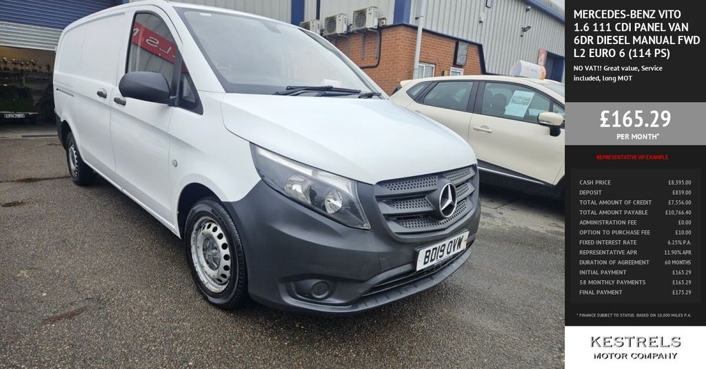 Halstead2 Previous Owners, This VAT free 2019 Mercedes Benz Vito 111 CDI includes a service, has some service history and an MOT valid until June 2026, offering peace of mind for its next owner. This L2 Euro 6 compliant model features a 1.6 litre diesel engine and a front wheel drive system, ensuring efficient performance. With a clear vehicle history check, you can be confident in its reliable provenance. The Vito 111 CDI offers an impressive cargo volume of 6300 litres, making it ideal for transporting goods. Its fuel economy of 46 mpg is a notable advantage, suggesting lower running costs compared to many other vehicles in its class. Furthermore, its low insurance group rating indicates that ownership and maintenance are designed to be cost effective. Part exchange welcome, finance arranged. 3 months warranty included..No VAT to pay! Great Value, Motorway use by local grocer. , New service included, long MOT, 3 months/3000 mile warranty included., Lovely condition throughout, 16in Steel Wheels, ABS AntiLock Braking System, Adaptive Brake Lamps, Adaptive ESP Electronic Stability Programme, Airbag Driver, Airbag Front Passenger, ASR AntiSlip Regulation, ATTENTION Assist, Audio 15, BAS Brake Assist, Bulkhead Full Steel, Crosswind Assist, Cruise Control with SPEEDTRONIC Speed Limiter, Cup Holder Front x2, Doors Twin Rear Doors Open to 180 Degrees, Doors Twin Sliding Side Solid, Dual Front Passenger Seat, EBD Electronic Brakeforce Distribution, Electric Windows Front, Electromechanical Steering, Folding Load Securing Rings Permanently Anchored, High Level Third Brake Light, Hill Start Assist, Immobiliser, Lockable Glove Compartment, Reflection Type Headlamps with Daytime Running Lamps, Remote Central Locking, SD Memory Card Slot, Seat Belt PreTensioners Front, Seat Belt Reminder Front, Service Indicator ASSYST, Steering Wheel 3Spoke Multifunction, Steering Wheel Rake and Reach Adjustment, Stowage Compartments Beneath the Windscreen x3, Three Point Seat Belts for all Seats, Trip Computer, Tyre Pressure Monitoring System, USB Port, Warning Lights for Oil Level Coolant Level Brake Fluid Brake Pads Bulb Failure and Door Closure, Washer Fluid Warning Light, WoodComposite Floor