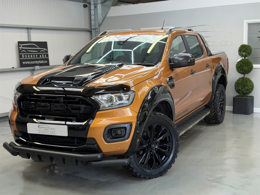 Ripley0 Previous Owners, NO VAT NO VAT WET BELT JUST DONE WITH SERVICE. ONE OWNER FROM NEW. STUNNING TOP OF THE RANGE 2.0 LITRE BI TURBO FACE LIFT FORD RANGER WILDTRAK AUTOMATIC FINISHED IN METALLIC SABOR ORANGE WITH BLACK LEATHER SEATS, SATELLITE NAVIGATION, REVERSE CAMERA, LED, BLUETOOTH, AUX, MULTI FUNCTION STEERING WHEEL, ELECTRIC WINDOWS, ELECTRIC HEATED SEATS, TOUCH SCREEN, ELECTRIC MIRRORS, AIR CONDITIONING, EURO 6, SYNC 3, ISOFIX, NEW GLOSS BLACK FORD RAPTOR GRILL, NEW 20 INCH BLACK ALLOYS WITH NEW ALL TERRAIN TYRES, APPLE CAR PLAY, LOCKABLE REAR ROLLER SHUTTER, NEW FRONT NUDGE BAR, NEW BONNET SCOOP WHICH IS FITTED AT CUSTOMER CHOICE, NEW GLOSS BLACK RAPTOR ARCHES, ULEZ, TOW BAR WITH ELECTRICS. 2 KEYS, FULL SERVICE HISTORY WITH SERVICE JUST CARRIED OUT, 12 MONTHS MOT UNTIL MARCH 2027 FINANCE AVAILABLE FROM 9.9% APR WITH HP OR PCP OPTIONS AVAILABLE AND ANY PART EXCHANGE WELCOME. CALL OUR SALES LINE ON 01483959939 TO BOOK AN APPOINTMENT OR WHATSAPP US ON 07515596289 PLEASE VISIT OUR WEBSITE FOR MORE PICTURES WWW.SURREY4X4.COM. 18in Alloy Wheels 8in Boulder GreyMachined,2 Key Fobs,ABS ESP and RollOver Mitigation,Air Conditioning Manual,Airbags Curtain,Airbags Driver and Front Passenger,Airbags Drivers Knee Bolster,Airbags Front Side,Airbags Passenger Deactivation,Body Coloured Plastic Front Bumpers,Boulder Grey Exterior Door Handle,Boulder Grey Exterior Mirror Finish,Boulder Grey Radiator Grille,Boulder Grey Step Design Rear Bumper,Cargo Box Power Point Plug,Chrome Lift Decklid Handle,Collision Mitigation System,Cool Box in Centre Console,Cruise Control with ASLD AEB and ISA,DayNight Inside Mirror,Daytime Running Lamps,Double Locking Power Door Lock with Flip Key,Driver Seat Back Mounted Map Pocket,Dual Control System EATC,Dual Power Heated Fold Back Mirrors with Puddle Lamps and Signal,Dyno Grey Sports Hoop with Side Rails,EPAS Electric Power Assisted Steering,Ebony Headliner,ElectricallyOperated Windows with OneShot Drivers Window,Electrochromic Inside Mirror,Fixed Rear View Camera,Ford SYNC 3 Single CDDAB Radio TMC and Active Noise Cancelling,FordPass Connect,Front Parking Aid,Front Seats Driver and Passenger Heated Seats,Front Splash Guard Mud Flaps,Gearshift Knob Leather,Headlights LED,Heated Windshield and Rear Window,High Mounted Stop Lamp with Cargo Light,ISOFIX Child Safety Seat Attachments,Inside Chrome Door Handles,Intelligent Speed Assistance,Interior Ambient LED Lighting,LED Front Fog Lamps,Lane Keeping Aid,Leather Seat Trim,Load Box Bedliner,Load Box Bedliner Power Point and Tie Down Hooks,Load Rest,Loadbox Inside Tie Down Hooks,Locking Rear Axle,Locking Wheel Nuts,Moulded in Colour Tailgate Handle,Mud Flaps Rear,Painted Front Fender Grill,Passive AntiTheft System,Passive Keyless Entry and Start,Power Converter,Power Tailgate Lock,Premium Front and Rear Floor Mats,Privacy Glass,Rain Sensitive Windshield Wipers,Rear Bumper Chromed Steel Step,Rear Parking Sensors,Rear Power Point Plug,Roof Rails,Roof Storage for Driver Sunglasses,Seats Drivers 8Way Adjustment,Side Step with Brushed Inserts,Spare Wheel Lock,Sport Leather Stitched Steering Wheel,Sports Bar with High Mounted Brake Light,Sports Hoop,TSR Traffic Sign Recognition,Tailgate with EasyLift Lower Mechanism,Thatcham Category 1 Security System,Tie Down Rail with Rope Hooks,Tyre Pressure Sensors,Under Body Protection,Under Hood Engine Cover,Wildtrak Door Trim Panel Insert