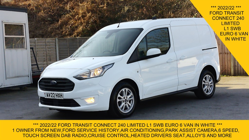0 Previous Owners, 2022/22 FORD TRANSIT CONNECT 240 LIMITED IN WHITE,EURO 6 ULEZ COMPLIANT,1 OWNER FROM NEW,FORD SERVICE HISTORY,REAR PARK ASSIST CAMERA,AIR CONDITIONING,ALLOY WHEELS,TOUCH SCREEN DAB RADIO,PARKING SENSORS,HEATED DRIVERS SEAT,ELECTRIC WINDOWS,6 SPEED MANUAL,ELECTRIC FOLDING MIRRORS,SIDE LOADING DOOR,STEEL BULKHEAD,LINED,AIRBAG,REMOTE CENTRAL LOCKING,BLUETOOTH CONNECTION,GOOD CONDITION THROUGHOUT,74.000 MILES,A FREE 3 MONTHS WARRANTY WITH THE OPTION TO EXTEND,GREAT FIXED RATE FLEXIBLE FINANCE AVAILABLE,ALL MAJOR DEBIT/CREDIT CARDS ACCEPTED.,ALL PRICES ARE PLUS VAT AT 20%. 12v and AUX Power Point in Instrument Panel,16in Alloy Wheels 7 Spoke Aluminium,AC Refrigerant R134A,Active Shutter Grille,Airbags Driver,Automatic Headlamp Control OnOff,Base Centre Console,Black Seat Belts,Body Colour Exterior Mirrors,Brakes HLAESPTCABS,Bulkhead Full Steel,Child Proof Rear Door Locks,Complete Rear Trim Board,Configurable Interior Light,Configurable Unlocking 1,Conventional Steel Spare Wheel,Courtesy Lights Front Dome Light with 2 Map Lights,Cup Holders Front x2,Daytime Running Lamps,Door Entry Remote Control Unit,Door Handles Body Colour,Door Handles Interior Bright Finish,Door Trim Panel Level 2,Door and Liftgate Handles Body Colour,Driver Airbag Restraint,Driver and Passenger Belt Minder,Driver and Passenger Sunvisors,EBA Emergency Brake Assist,Easy Clean Load Floor,EcoCoach,Electric Windshield Defroster,Emergency Brake Light Flashing,Engine Immobiliser,FordPass Connect Embedded Modem,Front Active Seat Belts,Front Bumper Body Colour,Front Fog Lights with Adaptive Cornering,Front Lip Spoiler,Front Passenger Seat Rotary Recliner,Front Seats 2Way Head Restraint UpDown,Front Seats Drivers Manual Rotary Recliner Seat,Front Skid Plates Self Colour,Front and Rear Towing Hooks,Gear Knob Leather,Glove Box with Lid,Glovebox Light,Halogen Headlights Side Lights Rear Fog Lights Reversing Lights,Heated Driver and Passenger Seats,Heavy Duty Battery,High Mounted Stop Lamp,High Series Fabric Soft Door Armrest,Hill Start Assist,ICE Feature Pack 154,Instrument Panel Stowage Box,Interior Grab Handles Front,Kerbside Side Load Door,Key Combination Pack 2 Contains 2 Remote Keys No Plain Key,Keyless Start,LED Load Compartment Light,Locking Wheel Nuts,Manual Air Conditioning Electric,Mid Series Analogue Cluster,Moulded In Colour 3Bar Radiator Grille,Non Infra Red Reflection Windscreen,NonLimited Slip Front Axle,Overhead Storage Shelf,Plastic Front Bumpers,Pollen Filter without Carbon Filter,Power Assisted Steering,Power Door Deadlocks Double Locking,Power Fold Door Mirrors Heated,Power Front Windows with OneShot UpDown,Rake and Reach Steering Adjustable,Rear Bumper Self Colour,Rear Bumper End Caps Body Colour,Rear Cargo Door Unglazed,Rear Doors 180 Opening,Rear Fog Lamps,Rear Normal Tinted Glass,Rear Suspension Twist Beam,Reverse Parking Aid,Rubber Partial Floor Cover,Seat Belts Front 3 Point with Seat PreTensioner Height Adjust and Load Limiters,Seat Belts Front Seat Manual Adjuster,Seat Pack 54,Seats Drivers 4Way Manual Adjustment,Seats Front Passenger 2Way Adjustment,Small Rear View Mirror Housing,Speed Control and ASLD,Standard Duty Alternator,Steering Wheel Leather,Steering Wheel Radio Controls,Thatcham Category 1 Alarm,Trip Computer,Wide Bodyside Mouldings Body Colour,Bulkhead Full Steel with Load Through Hatch,Frozen White,ICE Feature Pack 10,Seat Pack 31, Price Plus VAT