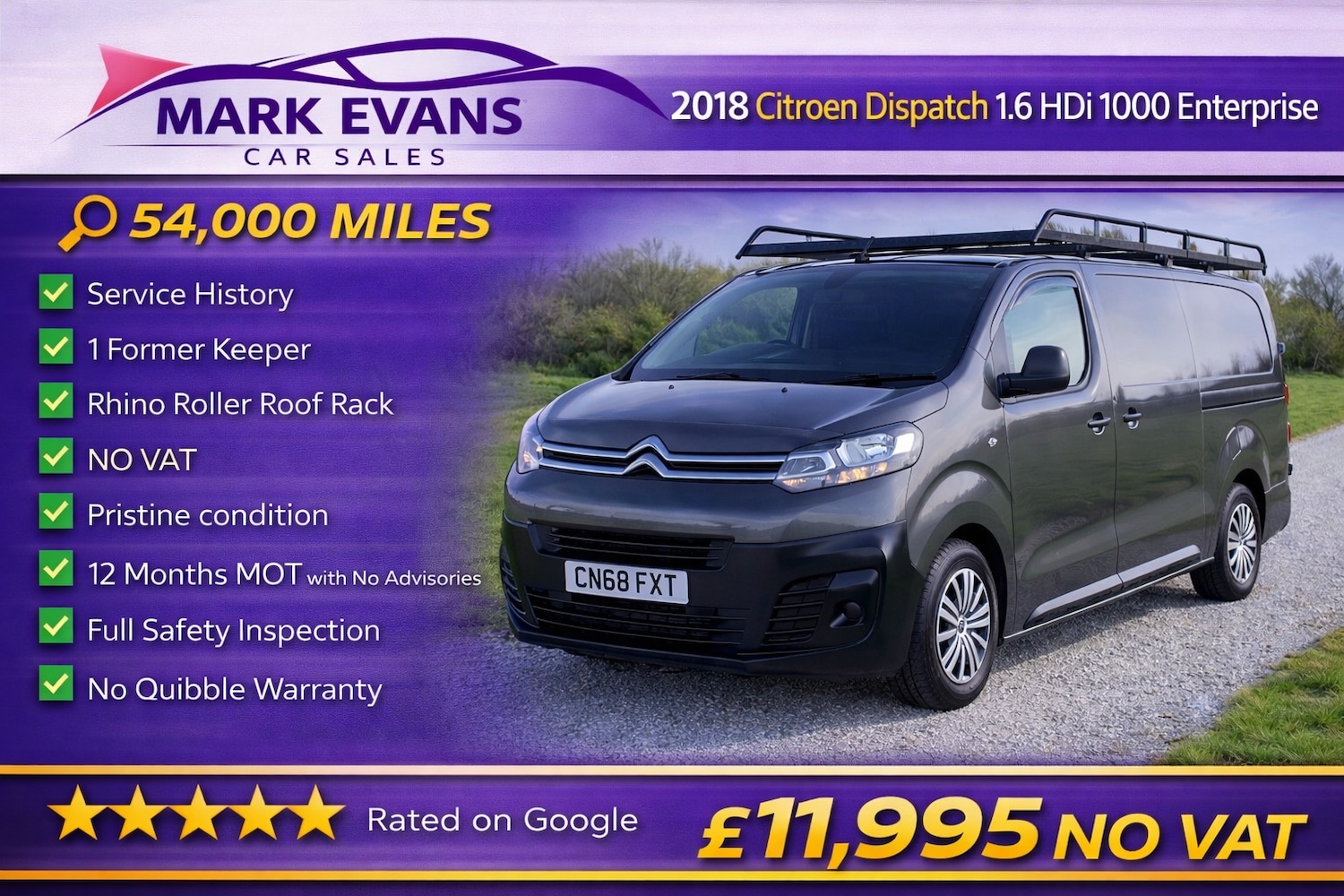 St AgnesNO VAT ONLY 54,000 MILES SERVICE HISTORY ONE FORMER KEEPER.... This 2018 Citroen Dispatch 1.6 HDi 1000 Enterprise Van has covered just 54,000 MILES from new and comes with service history. It has had one former keeper and is presented in pristine condition throughout, clearly reflecting careful ownership and light use. Modern vans with mileage this low and offered with NO VAT are becoming increasingly difficult to find..... The vehicle will be supplied with a brand new 12 month MOT with no advisories, a no quibble warranty, a full professional valet and a complete safety inspection, providing total peace of mind.... Powered by the proven and economical 1.6 HDi diesel engine, this Dispatch delivers excellent fuel economy, strong reliability and practical everyday usability.... The Enterprise specification provides a comfortable and well equipped driving environment, while the addition of a Rhino roller roof rack makes it ideal for trades and businesses requiring additional carrying capacity. Importantly, there is NO VAT to be added to the purchase price, making this van particularly attractive value.Offered at just £11,995 with NO VAT, this low mileage Citroen Dispatch represents outstanding value and a rare opportunity to secure such a well maintained example..... We specialise in sourcing the very best low mileage high quality vehicles. Mark Evans Car Sales is based in St Agnes Cornwall TR5 0PA. We pride ourselves on our honesty integrity and five star service. Please take a moment to read our five star Google reviews, we are very proud of them. The Evans family has been in the motor trade in Cornwall for over 50 years and we continue to work hard to uphold our reputation for quality and trust.