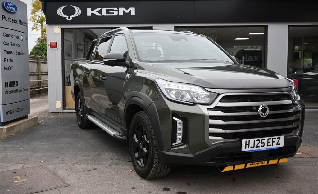 Wareham0 Previous Owners, Purbeck Motors have the pleasure in offering this Display Musso 2.2 Saracen Plus 4 WD LWB ** Finished in Amazon Green Metallic with Black Premium Nappa leather the Saracen Plus is a very high specification Pickup and Includes Yellow painted metal sump protector . Standard factory features include Heated and Cooled Front Seats** Heated Steering Wheel ,Rear view Camera with Front & Rear parking Sensors**Dual Zone Climate Control**12.3 Touch Screen with TomTom navigation Apple car Play and Android Auto. This is a sunning looking pickup in fantastic condition with over £4000 of extras fitted including Front sump cover painted Yellow , Extended wheel arch kit , Roll hoops , load cover and Bonnet protector and with only 102 miles on the clock and the balance of the 5 Year 100000 Mile Warranty** For more information please call Richard at Purbeck Motors Wareham on 01929552151. 12.3in HD Screen,12.3in Supervision Cluster with Colour TFTLCD Trip Computer,18in Alloy Wheels Black,6 Speakers,6Way PowerAdjustable Front Passenger Seat,8Way PowerAdjustable Drivers Seat with Power Lumbar,APillar Grab Handles,ABS with Electronic Brakeforce Distribution EBD,Air Vents for Rear Seat Passengers,Airbag OnOff Switch Front Passenger,AntiTheft Alarm with Immobiliser,Apple CarPlay and Google Android Auto,Automatic DeMisting System,Automatic DualZone Air Conditioning,Automatic Headlight Control and RainSensing Wipers,Black Finish Door Mirrors Belt Line and Tailgate Finisher,Black and Silver Roof Rails,Black and Silver Side Steps,Blind Spot Detection,Bluetooth Telephone Connectivity,Brake Assist System BAS,Childproof Safety Locks,Chrome Ladder Style Front Grille,Curtain Airbags for Front and Rear Seat Passengers,DAB Radio,Door Impact Beams for Added Protection from Side Collisions,Dual Airbags for Driver and Front Passenger,ESP Electronic Stability Programme,Electric Folding Heated Door Mirrors with Side Repeater,Electronic Cruise Control,Floor Mats,Front LED Fog Lights,Front Seatbelt PreTensioners,Glovebox with Illumination and Key Lock,HDC Hill Descent Control,HSA Hill Start Assist,Headlamp Levelling,Heated Steering Wheel,Height Adjustable Front Headrests,HighStrengthSteel Construction,Hydraulic and SpeedSensitive Power Steering,ISOFIX Child Seat Anchorage Rear Outer,Illuminated Sun Visor with Sliding Extension,Interior Colour Ash Black,Lane Change Assist,Leather Covered Steering Wheel with Graphite Accents,MP3 M4A APE OGG WMA FLAC and WAV File Format Play,Parking Sensors Front and Rear,Power Windows,Projection Headlamps,Push Button Start,Rear Cross Traffic Alert,Rear Parking Camera,Rear Privacy Glass,Rear Seat Armrest with Cup Holder,Remote Central Locking,Saracen Graphics,Satellite Navigation TomTom,Seats Heated Rear,Shark Fin Antenna,Side Airbags for Front Passengers,Stainless Front and PVC Rear Door Scuff Plates,Steering Column Lock,Steering Wheel Reach and Rake Adjustment,Steering Wheel Mounted Audio Controls,Traction Control,Trailer Sway Control,Tyre Parking Direction Indicator,Tyre Pressure Monitoring System,Tyre Repair Kit,USB and AUX Ports,UltraRigid Quad Frame for Greater Strength,Ventilated and Heated Front Seats,Visual VIN Plate,Woven Finish Accent to Fascia and Graphite Finish to Air Vents,Factory fit full engine sump guard,Sliding bed cover,Rear roll cage,heavy duty mat set,Towbar and electrics with tow ball and pin,Bonnet protection kit, Price Plus VAT