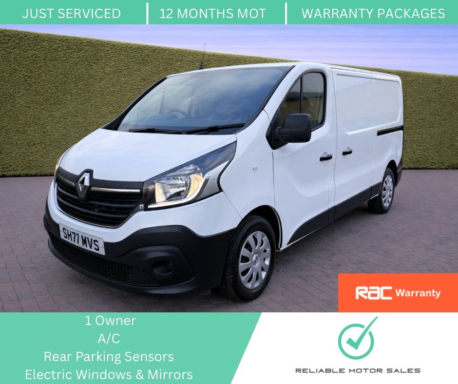 Brierfield0 Previous Owners, ALL OF OUR VEHICLES ARE SOLD WITH *12 MONTHS MOT* *A FRESH SERVICE* *PDI INSPECTION* * WARRANTY WHICH CAN INCLUDE RAC 6,12,24 OR 36 MONTH PLANS* *VALETED TO THE HIGHEST STANDARDS* *WALK ROUND VIDEOS ON REQUEST* GIVING YOU PIECE OF MIND WHEN PURCHASING FROM RELIABLE MOTOR SALES. This Renault Trafic is in excellent condition and comes with: 1 owner from new Full service history including just serviced by ourselves A/C Rear parking sensors Electric windows & mirrors DAB Bluetooth radio Ply lined rear Ready to drive away. FINANCE & UK DELIVERY AVAILABLE. Please call for viewings & test drives. .1 OWNER, FULL SERVICE HISTORY, REAR PARKING SENSORS, A/C, ELECTRIC WINDOWS & MIRRORS, 12V Power Socket Front, 16in Steel Wheel with Delos Wheel Trims, ABS with EBD Electronic Brake Force Distribution, Airbags Driver, Alarm, Anchorage Points x16, Black Door Mirrors, Black Door Rail, Black Front Bumper, Black Rear Tail Column, Bulkhead Full Steel, Closed Glovebox, DAB Radio with Bluetooth USB Socket and 2x15W Speakers, Deadlocking, Door Mirrors Heated with Electric Adjustment and External Temperature Sensor, Drivers Seat with Armrest Height Adjustment and Lumbar Adjustment, ESC Electronic Stability Control with HSA Hill Start Assist and Grip Xtend, Electric Front Windows Drivers Side One Touch Descending, Electronic Engine Immobiliser, Gear Change Indicator, Key 3 Button with Selective Opening, Left Side Loading Door Unglazed, Passenger Bench Seat, Power Assisted Steering, Rear Doors 180 Degree Solid, Remote Central Locking, Roof Bars Fixings, Seatbelts 3 Point Heightadjustable Seatbelts with Pretensioners and Load Limiters, Spare Wheel with AntiTheft Spare Wheel Holder, Steering Wheel Rake and Reach Adjustable, Trip Computer, Engine Speed Limiter 68mph 110kph, Glacier White, Manual Air Conditioning with Pollen Filter, Parking Sensors Rear, Price Plus VAT
