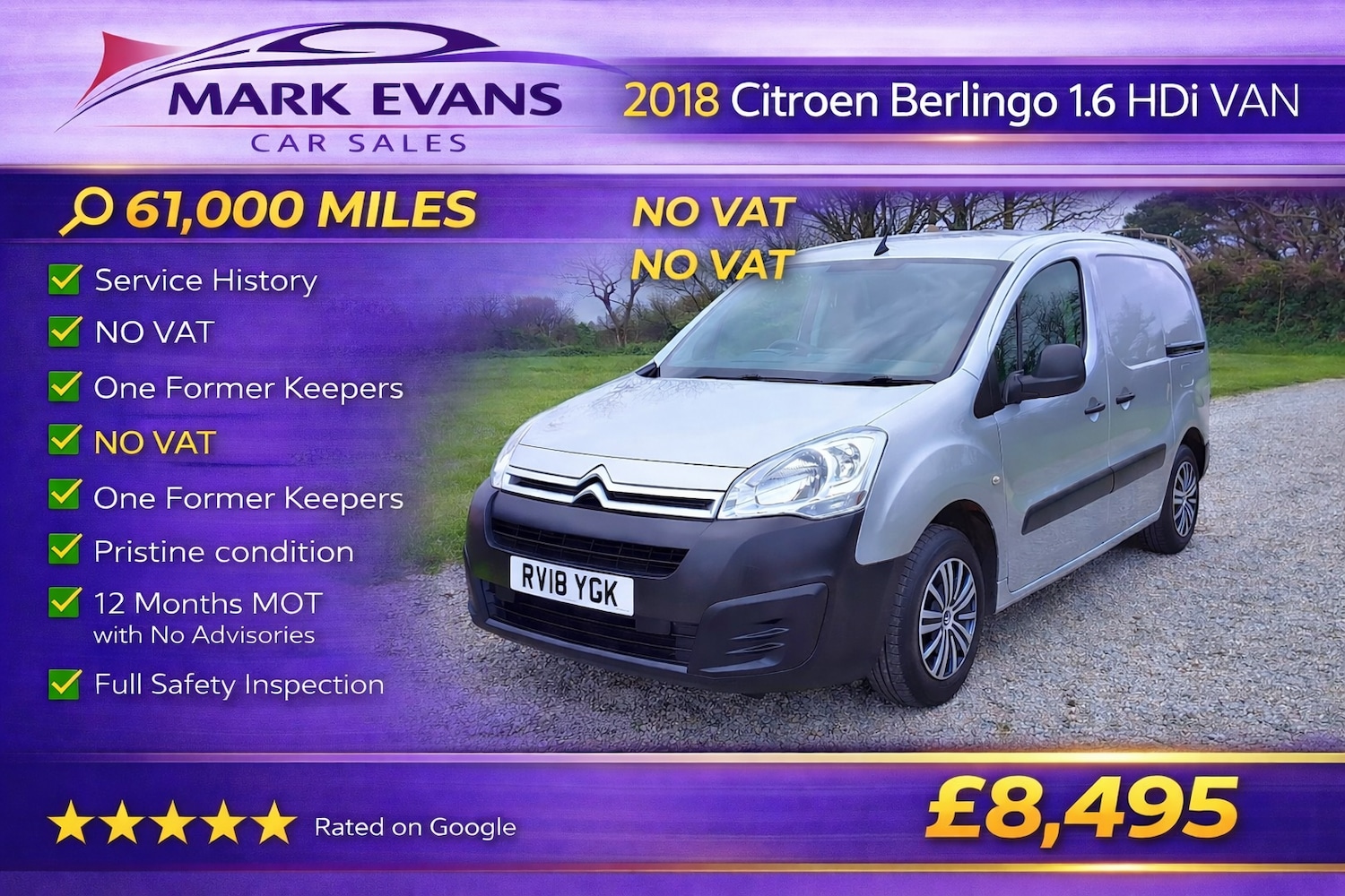 St AgnesNO VAT 61,000 MILES SERVICE HISTORY ONE FORMER KEEPER NO VAT......This 2018 Citroen Berlingo 1.6 HDi Van is a superb example with 61,000 MILES from new, supported by a SERVICE HISTORY. It has had only ONE FORMER KEEPER and is presented in pristine condition, clearly very well cared for..... A huge benefit with this van is that it is NO VAT, making it an excellent value option compared to many others on the market. The price you see is the price you pay...... The vehicle will be supplied with a brand new 12 MONTH MOT with NO ADVISORIES, a NO QUIBBLE WARRANTY, a full professional valet and a complete safety inspection, giving total peace of mind...... Powered by the reliable 1.6 HDi diesel engine, this Berlingo offers excellent fuel economy, strong reliability and great practicality. With its generous load space and easy driving nature, it is an ideal choice for both business and everyday use......At £8,495 NO VAT this is a fantastic opportunity to purchase a well maintained, practical and highly economical van with the added benefit of NO VAT...... We specialise in sourcing the very best low mileage high quality vehicles. Mark Evans Car Sales is based in St Agnes Cornwall TR5 0PA. We pride ourselves on our honesty integrity and five star service. Please take a moment to read our five star Google reviews, we are very proud of them. The Evans family has been in the motor trade in Cornwall for over 50 years and we continue to work hard to uphold our reputation for quality and trust.