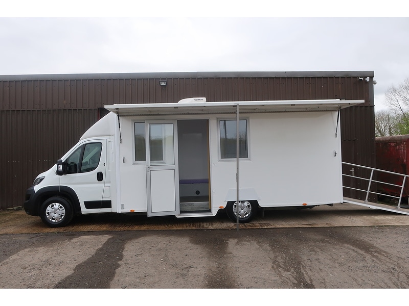 1 Previous Owner, This Peugeot Boxer 2.0 Blue HDI 440 Mobile Exhibition Van (160 bhp) is presented with features including Euro 6 Emissions(ULEZ Compliant), air conditioning, reverse assist camera, reverse parking sensors, bluetooth, cruise control, DAB radio, electric windows & mirrors, heated mirrors, lane departure warning, dual passenger seat, drivers arm rest, rear seating areas, storage cupboards, rear air con & heating, sink, loading ramp, side opening canopy, spare key and our 5 star service package included !!!., Price Plus VAT